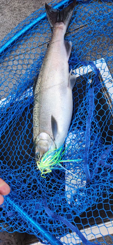 Today was an awesome day as I took my wife and kids out after lunch. We hoped to get out sooner but waited for the rain to stop. It turned out we didn’t need to get there any earlier as it only took us a few hours to limit out. Stick baits on the planner boards and spoons on the riggers were the ticket.