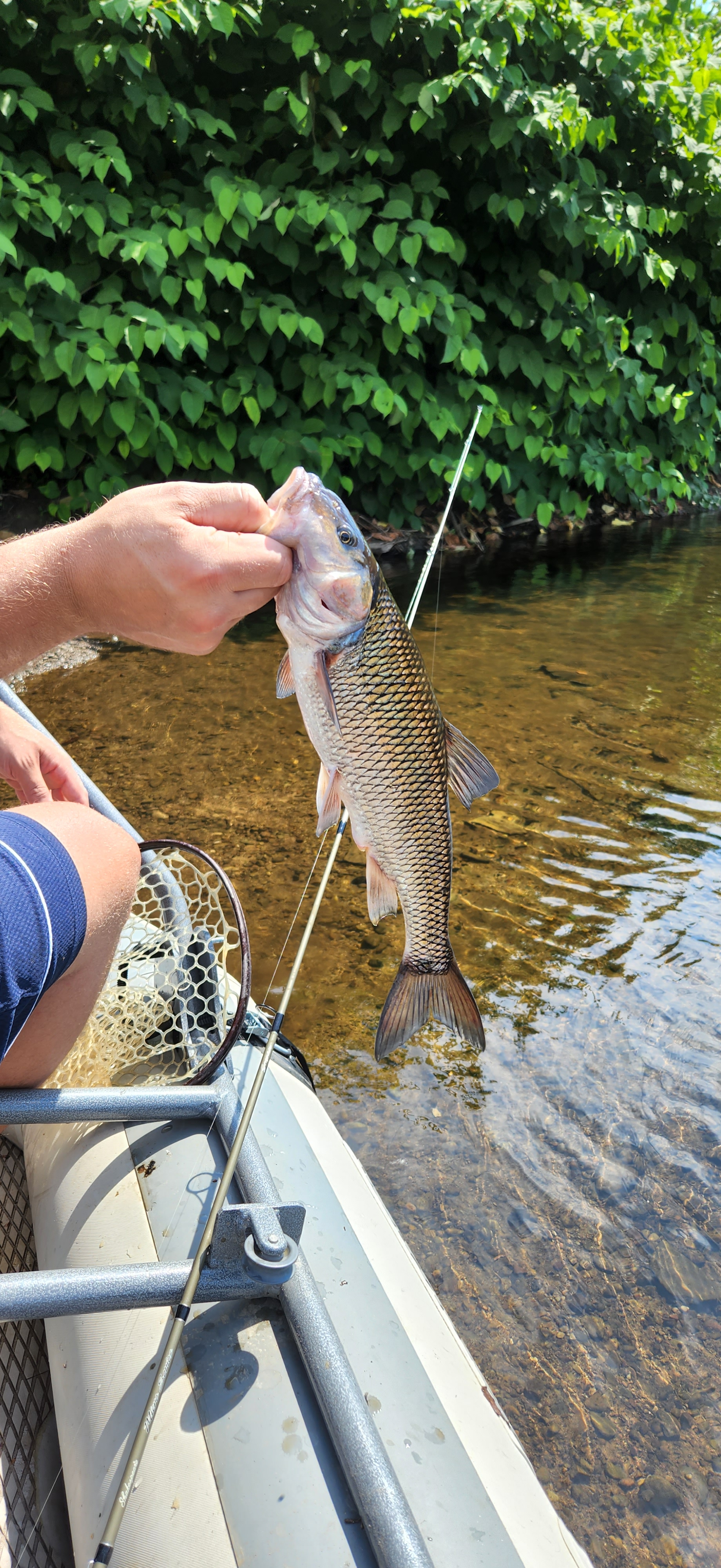 The fishing was nothing short of fantastic with a combination of small mouth bass, brown trout and some big fall fish. One fall fish may very well have broken the state record. We had thoughts of filling the cooler with water and getting it weighed when we were done. The 90 degree heat and lack of scale on the raft to get an estimated weight ended those thoughts. It seemed like a lot of hassel for a maybe.
