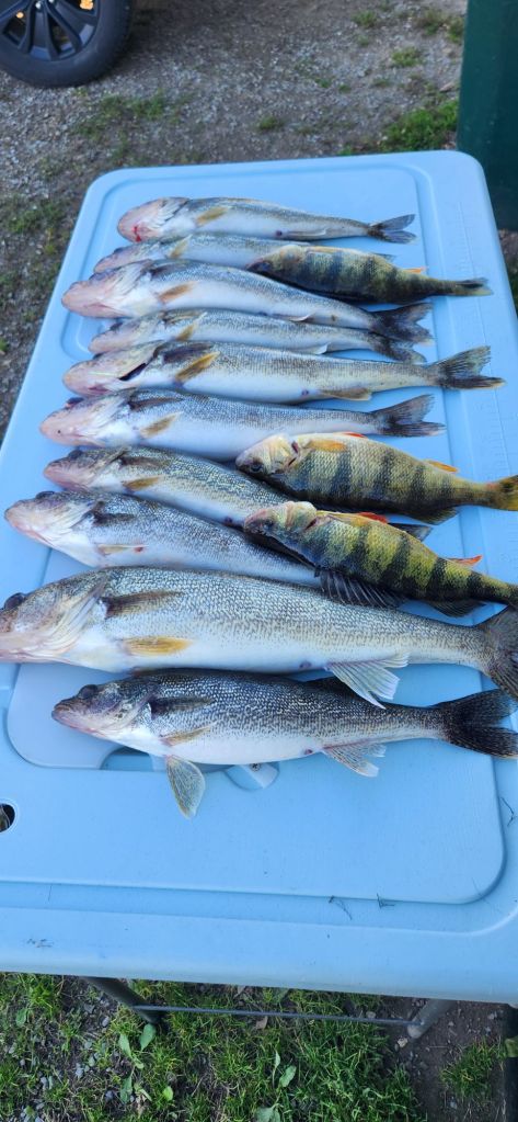We launched just after 7, and it wasn’t long before we were putting a nice walleye in the live well. We had started fishing out deep and found fish right tight to the bottom. Using lead core rods, we were able to get our baits down to the fish and took home 10 keeper walleye and 3 big perch. I lost count of how many short or just barely 15 inch fish we released. I was pulling a deep thunderstick, and Mike was pulling a storm thin fin. We also took 3 bites off a chinook diver and thunder stick rig I put out on my side just to try out. One of the 3 was a keeper. Overall, it was a great morning on the water that put some tasty filets in the freezer.