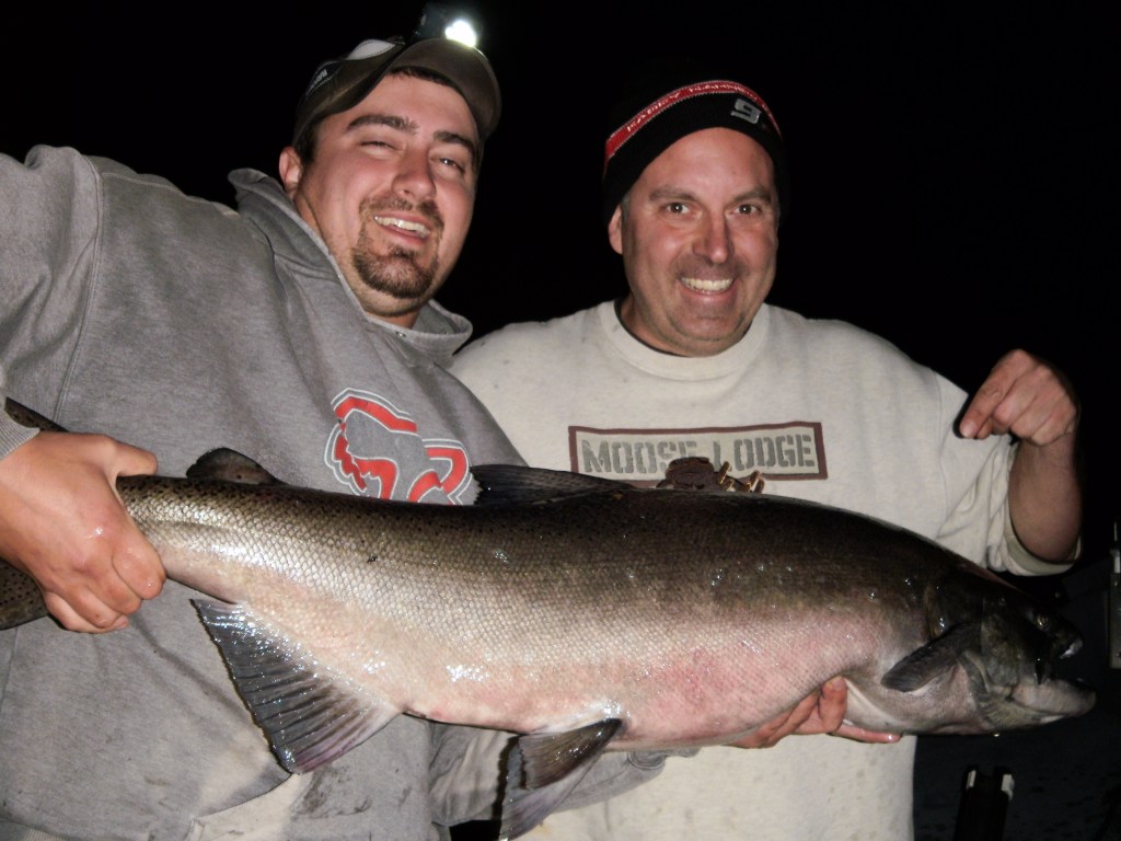 Once the fish are staging infront of the river mouth, normally September through the beginning of October, I also start fishing them at night. This is normally done trolling glow lures. There is also the option to cast spoons and plugs from the boat. Due to fishing in the dark calm waters are a must. That being said if the lake is too rough to fish most nights we have the option of going to the Oswego or Black River. These are a nice option over cancelling the trip.