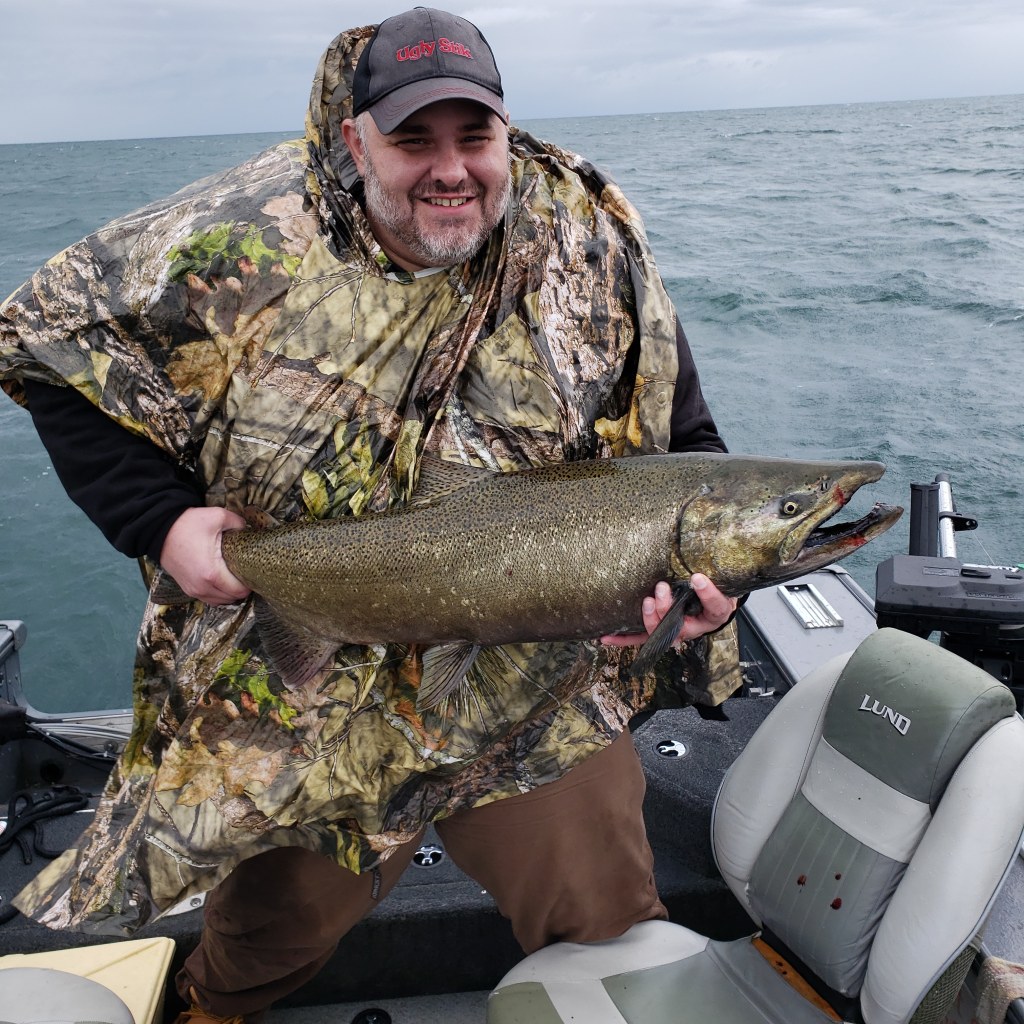 King salmon fishing in Upstate New York can be done in a variety of ways. I start fishing for them in July trolling on Lake Ontario. These trips are very wind dependent as we need fairly calm waters to get out. I prefer 3 foot or less as anything over that isn’t very enjoyable in my boat. As the fish move in front of the Salmon River we start trolling closer to shore. Again calm water is more enjoyable but we aren’t running far off shore so we can fish in a little bigger water.